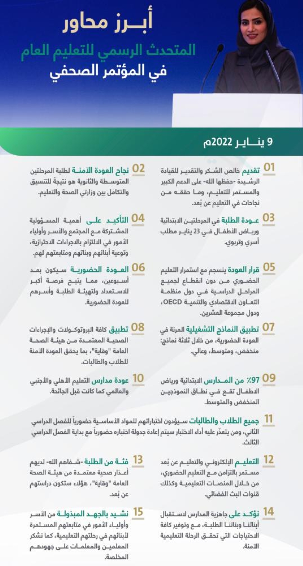 وأشارت الى أن 9. 97% من المدارس الابتدائية ورياض الاطفال تقع في نطاق النموذجين المنخفض والمتوسط، ومدارس التعليم الأهلي والأجنبي والعالمي ستعود كما كانت قبل الجائحة.