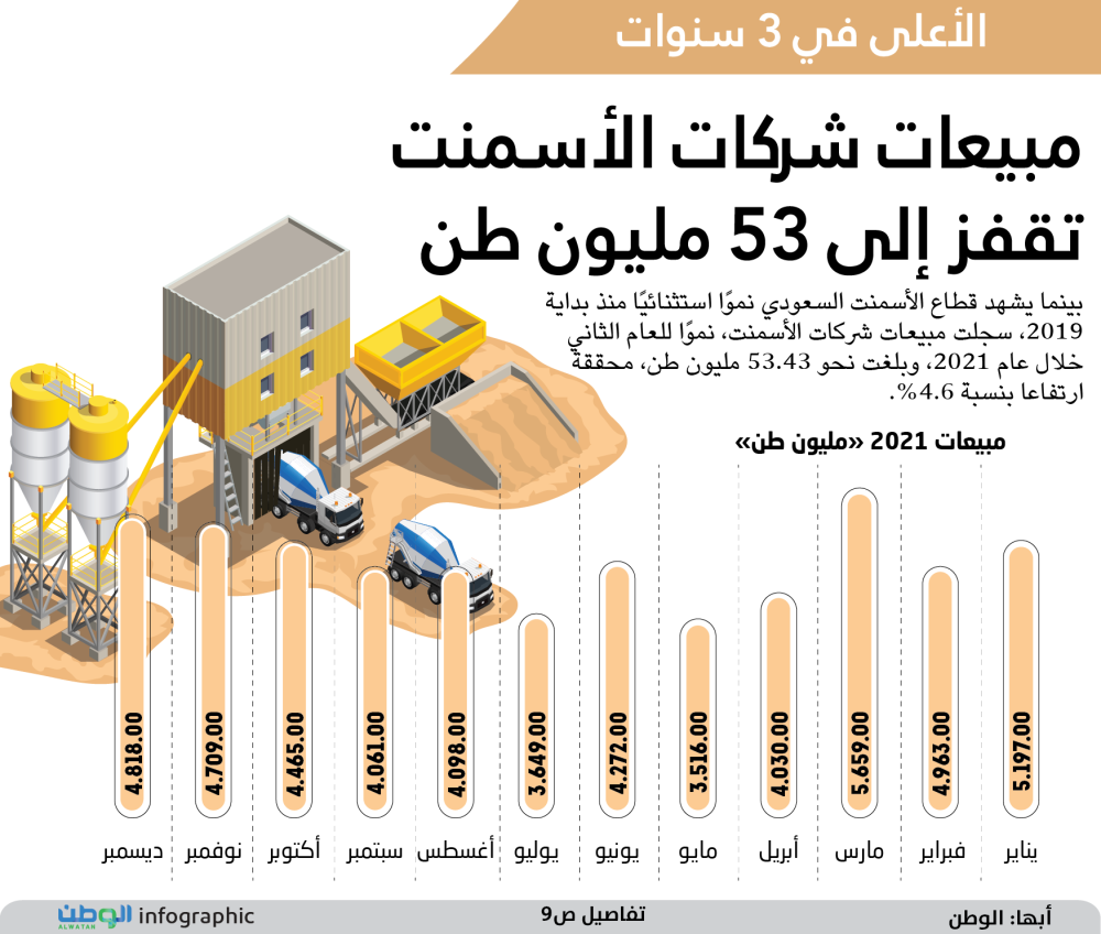 أظهر تحليل «الوطن» وفقاً للبيانات الشهرية لشركة أسمنت اليمامة، ارتفاع مبيعات شركات الأسمنت «التسليمات المحلية والتصدير»، على أساس سنوي خلال 2021 بواقع 2.35 مليون طن، حيث بلغت مبيعات شركات الأسمنت السعودية خلال العام 2020، نحو 51.08 مليون طن.