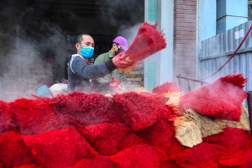 عامل يصبغ أعواد البخور في ورشة عمل، في قرية كوانج فو كاو، على مشارف هانوي، قبل احتفالات رأس السنة القمرية، المعروفة في فيتنام باسم تيت. «أ ف ب»