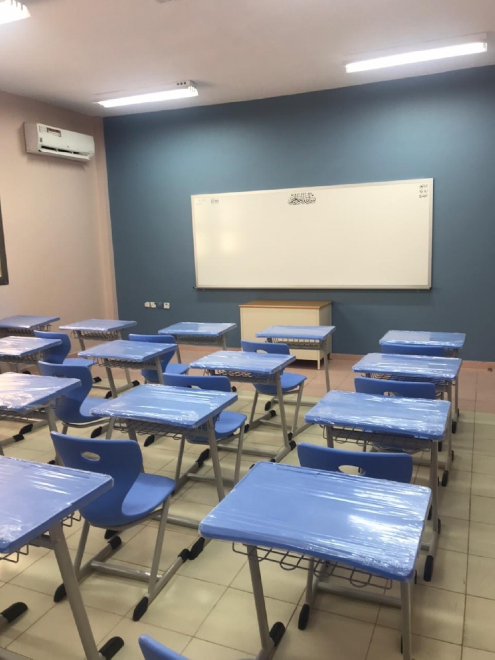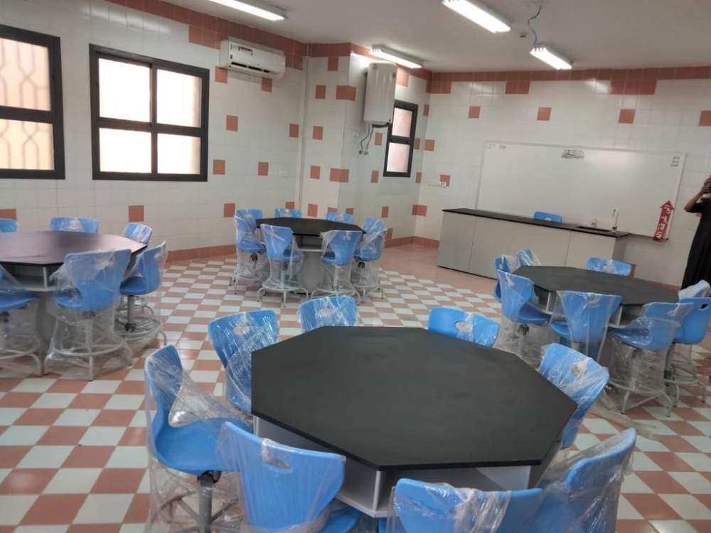 كما تم تجهيز 43 فصلاً ذكياً بسبورات ذكية وبروجكترات وجهاز حاسب آلي؛ وتجهيز 5 مراكز توحد للطالبات بالطاولات الدائرية الخاصة بكامل مستلزماتها.