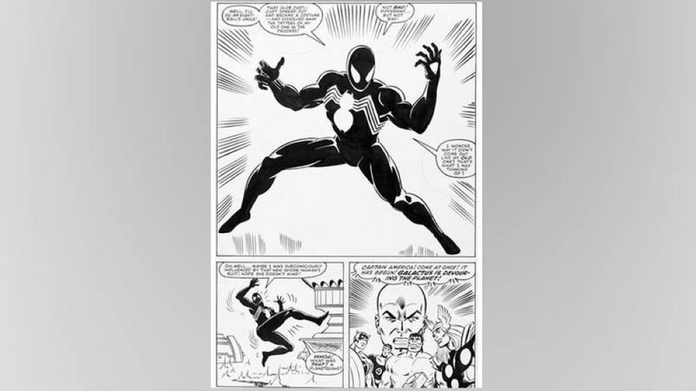 تتكوّن هذه الصفحة، التي أنجزها مايك زيك، والمأخوذة من العدد الثامن من سلسلة «سيكرت وورز»، التي نشرتها «مارفيل كوميكس» في 1984 و1985، من 3 خانات. ويظهر فيها البطل الخارق للمرة الأولى بالزي الأسود، الذي سيثبت أنّه «سيمبيوت» (طفيلي فضائي)، وسيسهم في تكوّن الشرير الخارق «فينوم».