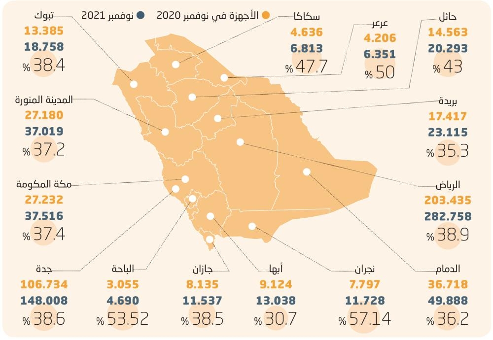 وفق بيانات 14 مدينة شملها الرصد، تصدرت نجران الأعلى نموا في عدد أجهزة نقاط البيع، وبلغت بنهاية نوفمبر 2021 نحو 11.728 جهازا مقابل 7.797 جهازا، بنهاية الشهر المماثل من 2020، وتلتها الباحة بنسبة نمو بلغت 53.52 %، فيما كانت النسبة في الرياض نحو 39 % وفي جدة 39 %، وفي الدمام 36.2 %.