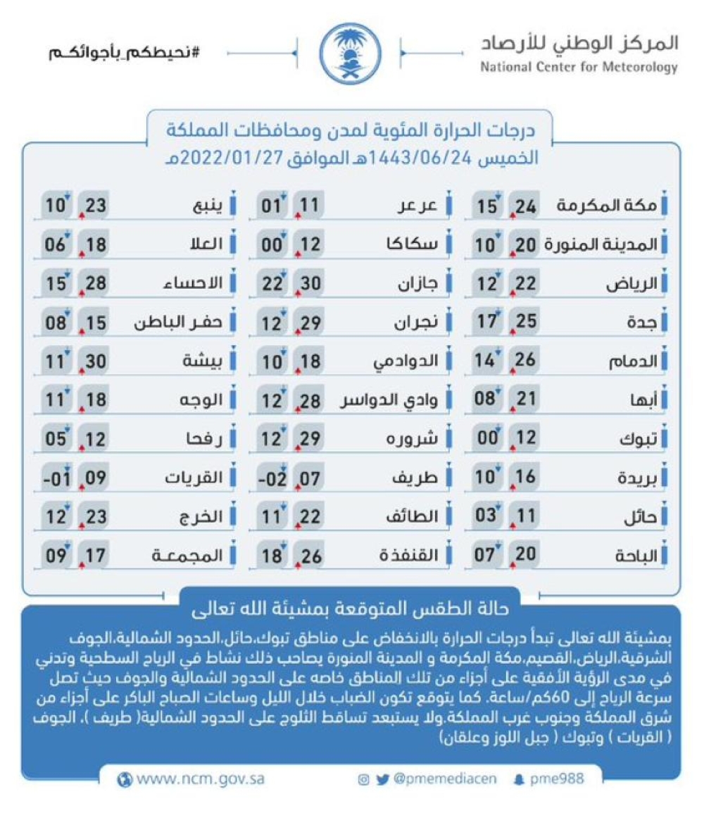 كما توقع المركز الوطني للأرصاد في تقريره عن حالة الطقس لهذا اليوم - بمشيئة الله تعالى - انخفاض درجات الحرارة على مناطق تبوك، حائل، الحدود الشمالية، الجوف، الشرقية، الرياض، القصيم، مكة المكرمة والمدينة المنورة يصاحب ذلك نشاط في الرياح السطحية وتدني في مدى الرؤية الأفقية على أجزاء من تلك المناطق خاصه على الحدود الشمالية والجوف حيث تصل سرعة الرياح إلى 60 كم/ساعة. كما يتوقع تكون الضباب خلال الليل وساعات الصباح الباكر على أجزاء من شرق المملكة وجنوب غرب المملكة, ولا يستبعد تساقط الثلوج على الحدود الشمالية (طريف)، الجوف (القريات) وتبوك (جبل اللوز وعلقان).