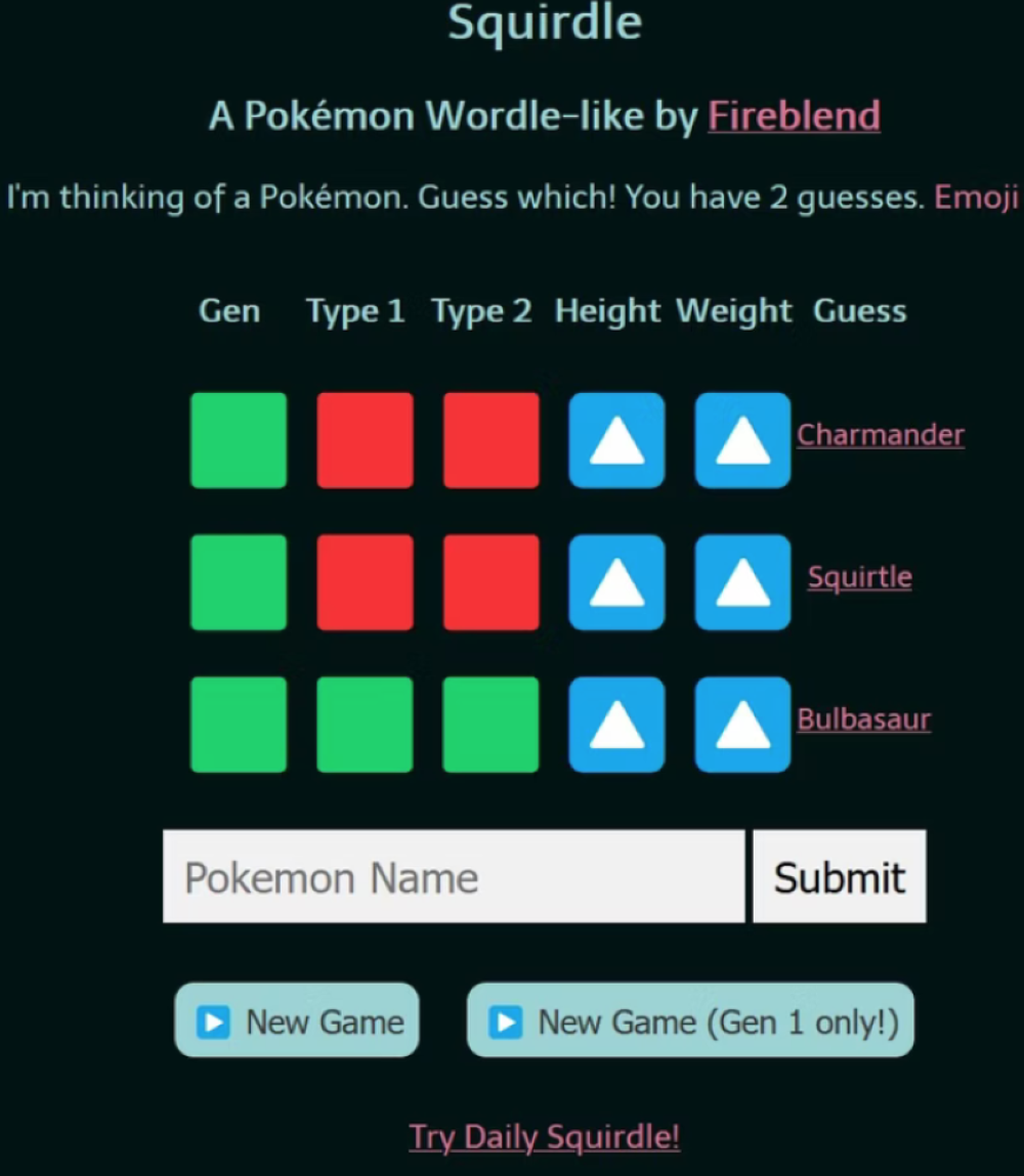 إذا كنت تحب Pokémon، فإن Squirdle هو البديل Wordle المناسب لك. بدلاً من تخمين الكلمات المكونة من خمسة أحرف، يمنح هذا الإصدار للاعبين خمسة تخمينات لاستنتاج وحش جيب معين من Pokédex المعروف بالكامل أو من أصل 151. مع كل تخمين، سيتم إخبارك ما إذا كنت قد وجدت الكتابة الأولية الصحيحة و ستتمكن من صقل إجاباتك بشكل أكبر من خلال مقارنات الطول والوزن.