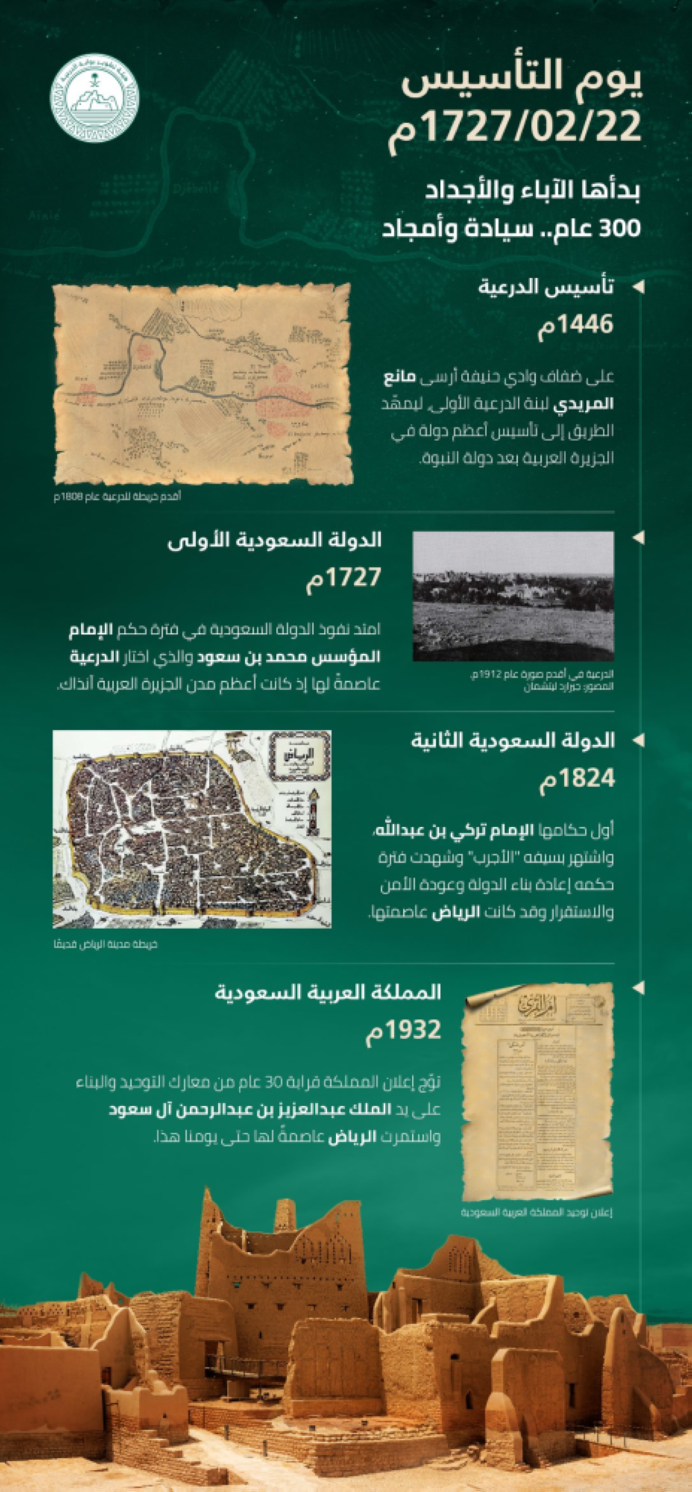 توج إعلان المملكة قرابة 30 عامًا من معارك التوحيد والبناء على يد الملك عبدالعزيز بن عبدالرحمن آل سعود واستمرت الرياض عاصمة لها حتى يومنا هذا.