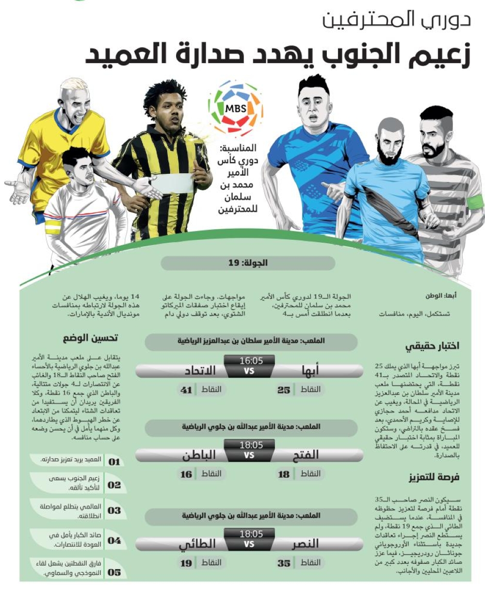 تبرز مواجهة أبها الذي يملك 25 نقطة والاتحاد المتصدر بـ41 نقطة، التي يحتضنها ملعب مدينة الأمير سلطان بن عبدالعزيز الرياضية في المحالة، ويغيب عن الاتحاد مدافعه أحمد حجازي للإصاية وكريم الأحمدي، بعد فسخ عقده بالتراضي، وستكون المباراة بمثابة اختبار حقيقي للعميد، في قدرته على الاحتفاظ بالصدارة.