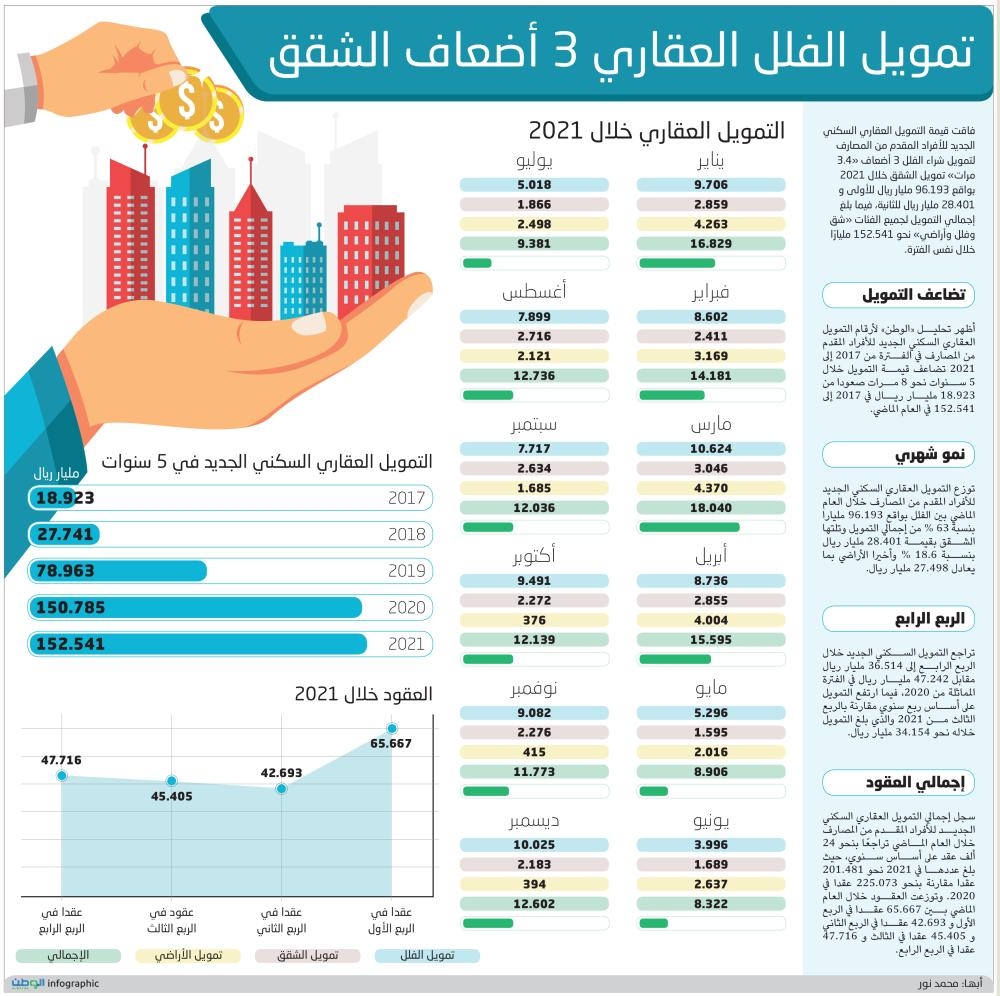 وأظهر تحليل «الوطن» لأرقام التمويل العقاري السكني الجديد للأفراد المقدم من المصارف في الفترة من 2017 إلى 2021 تضاعف قيمة التمويل خلال 5 سنوات نحو 8 مرات صعودا من 18.923 مليار ريال في 2017 إلى 152.541 في العام الماضي.