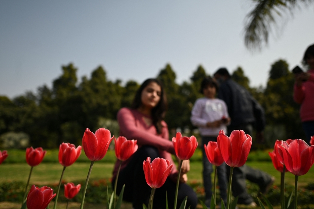 امرأة تتأمل جمال زهور الأقحوان، بجانب أشخاص يلتقطون صورا لها، على جانب طريق في نيودلهي. «أ ف ب»