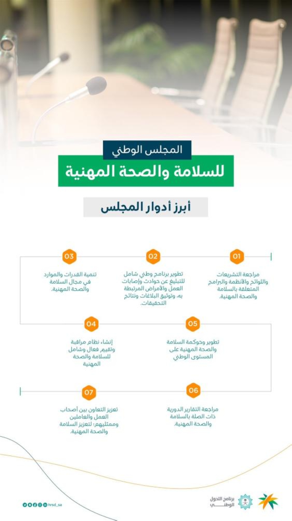 ومن أبرز مهام المجلس إنشاء نظام مراقبة شامل، وتطوير برنامج وطني للتبليغ عن الحوادث والإصابات، وتنمية القدرات والموارد في مجال السلامة والصحة المهنية.