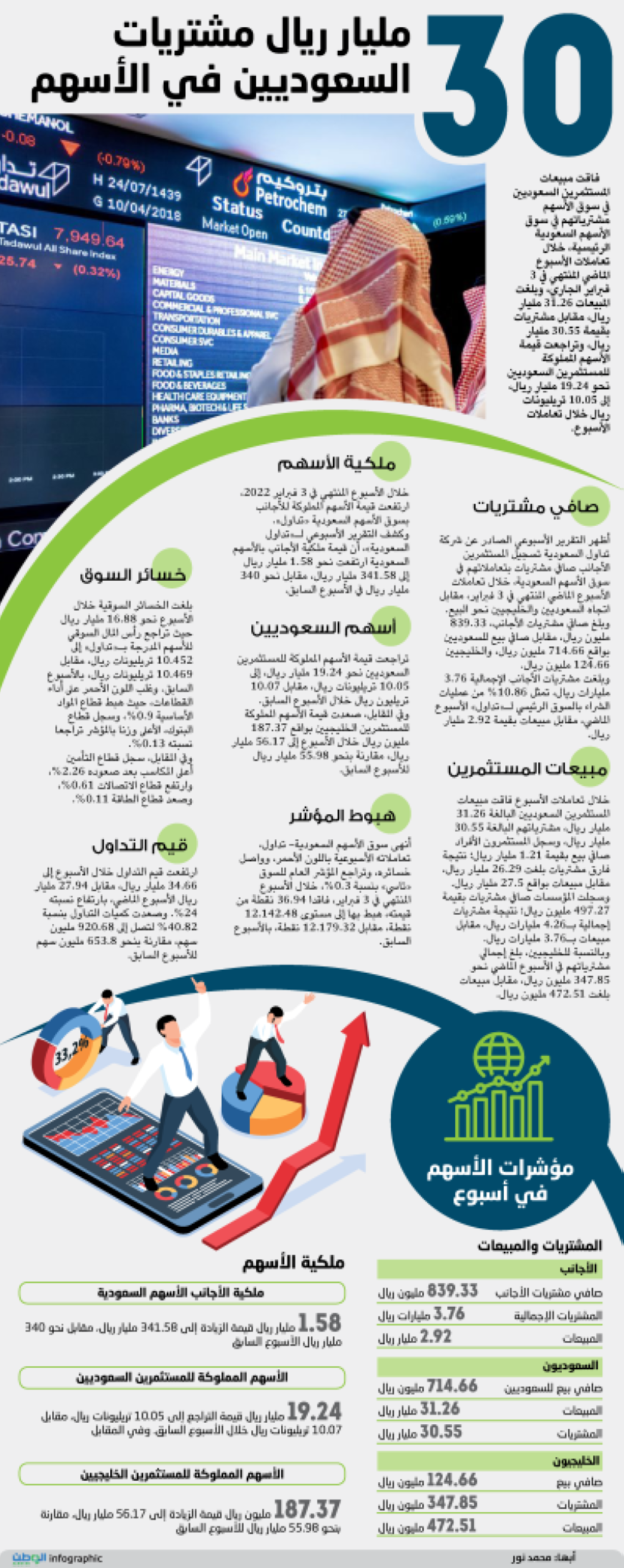 خلال تعاملات الأسبوع فاقت مبيعات المستثمرين السعوديين البالغة 31.26 مليار ريال، مشترياتهم البالغة 30.55 مليار ريال، وسجل المستثمرون الأفراد صافي بيع بقيمة 1.21 مليار ريال؛ نتيجة فارق مشتريات بلغت 26.29 مليار ريال، مقابل مبيعات بواقع 27.5 مليار ريال.