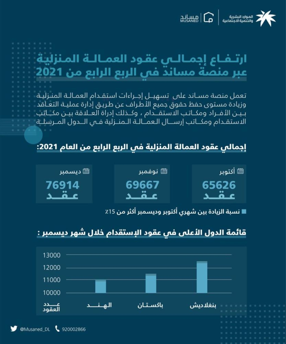 وتصدرت جمهورية بنغلاديش قائمة الدول الأكثر في عقود الاستقدام للعمالة المنزلية عبر منصة مساند خلال شهر ديسمبر من العام 2021، وذلك بأكثر من 12 ألف عقد، بينما جاءت بالمرتبة الثانية جمهورية باكستان الإسلامية بما يزيد عن 11 ألف عقد، وثم جمهورية الهند بنحو 11 ألف عقد، حيث سجلت الأخيرة إقبالاً في إصدار العقود منها مقارنة بشهري أكتوبر ونوفمبر.