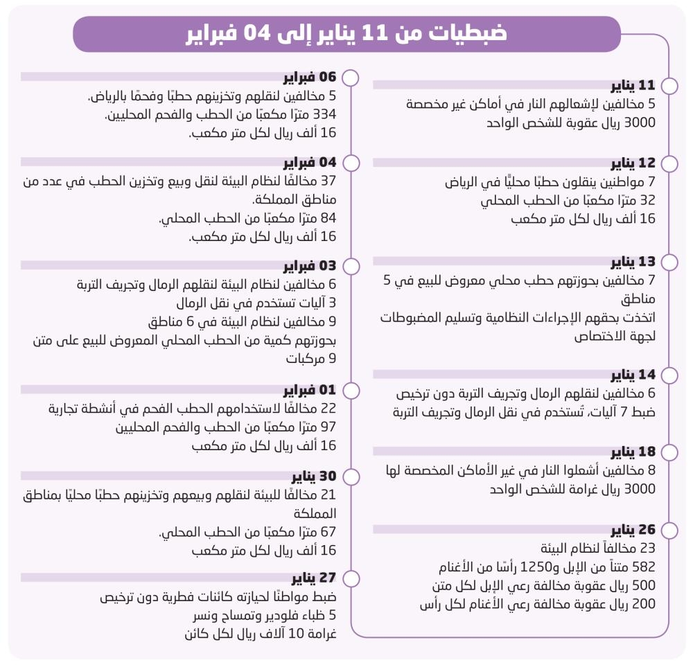 وتمكن الأمن البيئي من الإطاحة بـ 108 مخالفين بحوزتهم حطب محلي معروض لأغراض تجارية، بالإضافة إلى ضبط أدوات تستخدم لتقطيع الأشجار وتفحيمها وتصل عقوبة قطع الأشجار 20 ألف ريال لكل شجرة وعقوبة بيع الحطب المحلي 16 ألف ريال لكل متر مكعب، وجرى ضبط مواطنًا لحيازته 7 كائنات فطرية دون ترخيص بخميس مشيط بغرامة تبلغ 10 آلاف ريال لكل كائن، وكلك ضبط 13 مخالفًا لإشعالهم النار في غير الأماكن المخصصة لها في عدد من مناطق المملكة، وطبقت بحقهم الإجراءات النظامية وغرامة تصل إلى 3000 ريال لكل منهم.