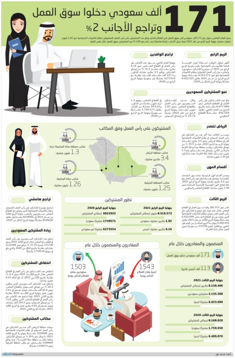 وكان عدد المشتركين السعوديين على رأس العمل بالقطاع الخاص، بنحو 1.92 مليون مشترك، بنهاية الربع الرابع من عام 2021، بنسبة 23.75 % من إجمالي المسجلين في القطاع الخاص، بينهم 1.2 ترك مليون مشترك من الذكور، و693.65 مشتركا من الإناث. مقابل 1.749.571 مشتركًا سعوديًّا بنهاية الربع الرابع من 2020.