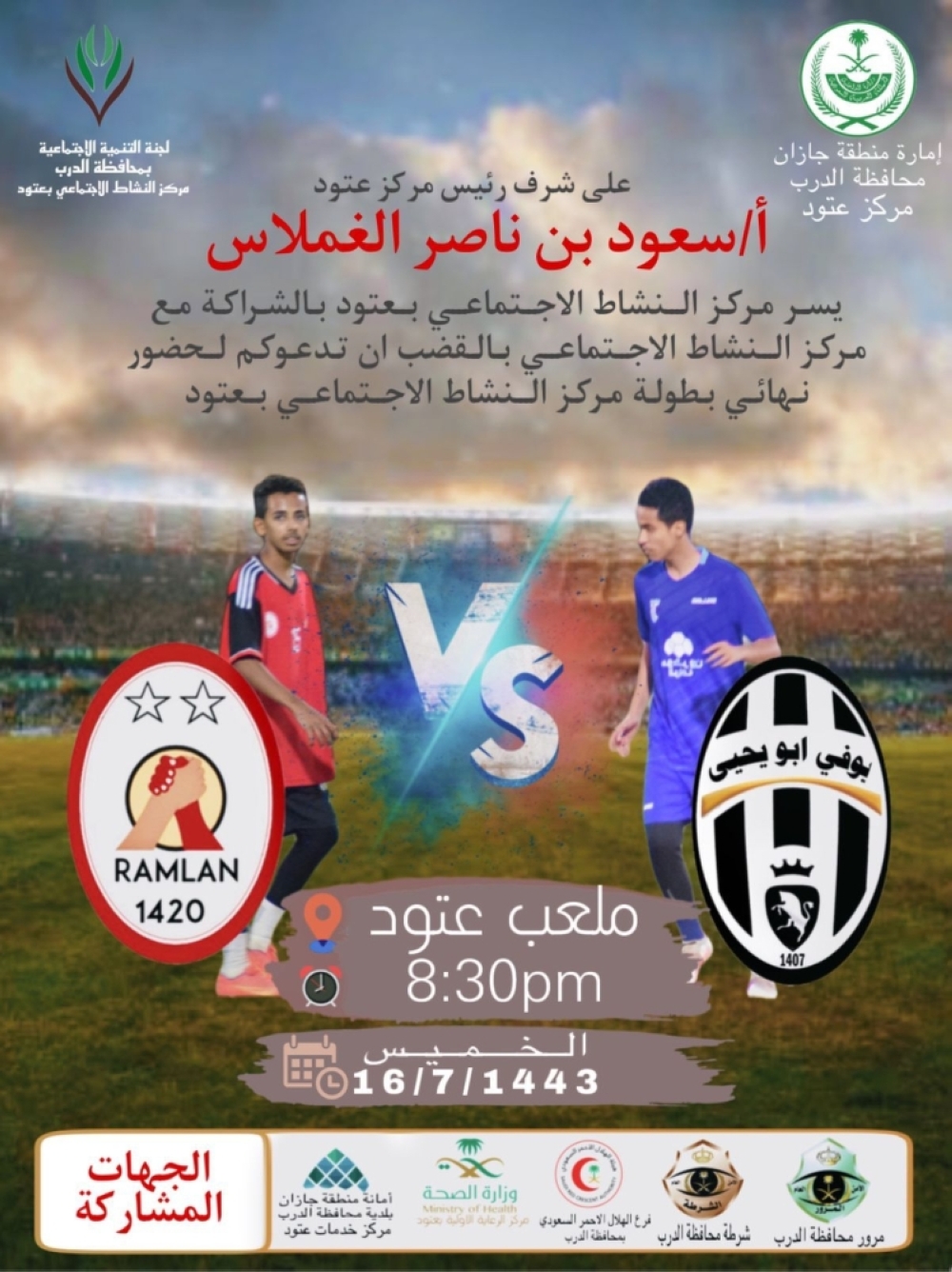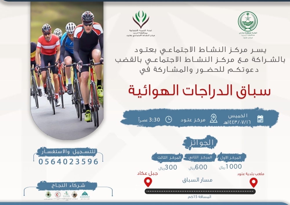 ينطلق سباق الدراجات الهوائية في مركز عتود بمحافظة الدرب شمال جازان عصر اليوم ضمن البرنامج النهائي للبطولة الرياضية التي تجمع فريقي يوفي أبو يحيى وفريق رملان، على ملعب عتود، برعاية رئيس المركز سعود بن ناصر الغملاس. وأشار رئيس مركز النشاط الاجتماعي بمركز عتود إسماعيل شرفي إلى أن مركزي النشاط الاجتماعي في عتود والقضب يركزان على صقل المواهب الرياضية واكتشافها وتطويرها لخدمة الرياضيين في المركز، بتنظيمهم بطولة رياضية لكرة القدم للفرق المختلفة بالمحافظة خلال برنامج فعاليات الشتاء، والتي يلتقي فيها فريقا (يوفي أبو يحيى) وفريق (رملان) على ملعب عتود برعاية رئيس المركز سعود الغملاس.