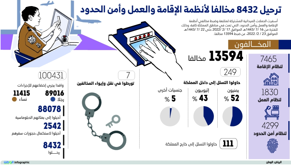 ترحيل 8432 مخالفا لأنظمة الإقامة والعمل وأمن الحدود