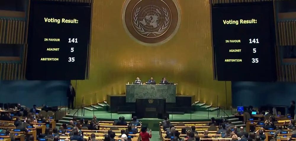 يطالب القرار الذي قوبل تبنيه بالتصفيق بعد أكثر من يومين من المداخلات موسكو "بأن تسحب على نحو فوري وكامل وغير مشروط جميع قواتها العسكرية" من أوكرانيا، و"يدين قرار روسيا زيادة حالة تأهب قواتها النووية".
