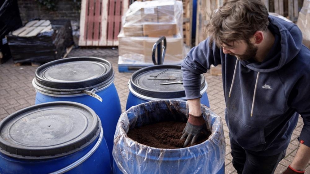 ويجول درو رايت يومياً بدراجته الهوائية على 25 مقهى يقدّم الشاي والقهوة في أنحاء لندن، ويجمع لشركة «أب سيركل» نحو 100 كيلو جرام من تفل القهوة الذي كان أصلاً سيُرمى.