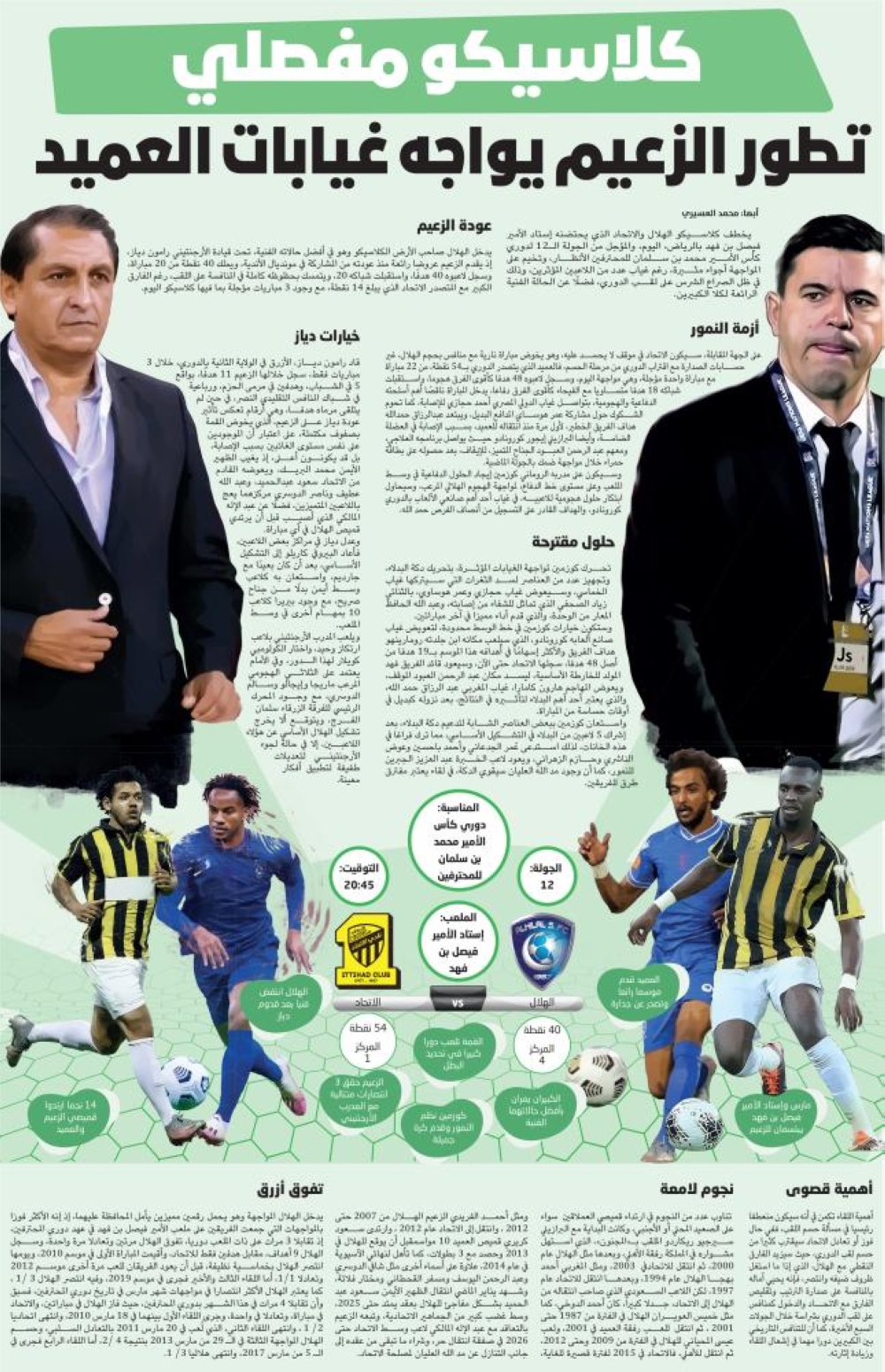 قاد رامون دياز، الأزرق في الولاية الثانية بالدوري، خلال 3 مباريات فقط، سجل خلالها الزعيم 11 هدفًا، بواقع 5 في الشباب، وهدفين في مرمى الحزم، ورباعية في شباك المنافس التقليدي النصر، في حين لم يتلقى مرماه هدفا، وهي أرقام تعكس تأثير عودة دياز على الزعيم، الذي يخوض القمة بصفوف مكتملة، على اعتبار أن الموجودين على نفس مستوى الغائبين بسبب الإصابة، بل قد يكونون أعلى، إذ يغيب الظهير الأيمن محمد البريك، ويعوضه القادم من الاتحاد سعود عبدالحميد، وعبد الله عطيف وناصر الدوسري مركزهما يعج باللاعبين المتميزين، فضلًا عن عبد الإله المالكي الذي أصيب قبل أن يرتدي قميص الهلال في أي مباراة.