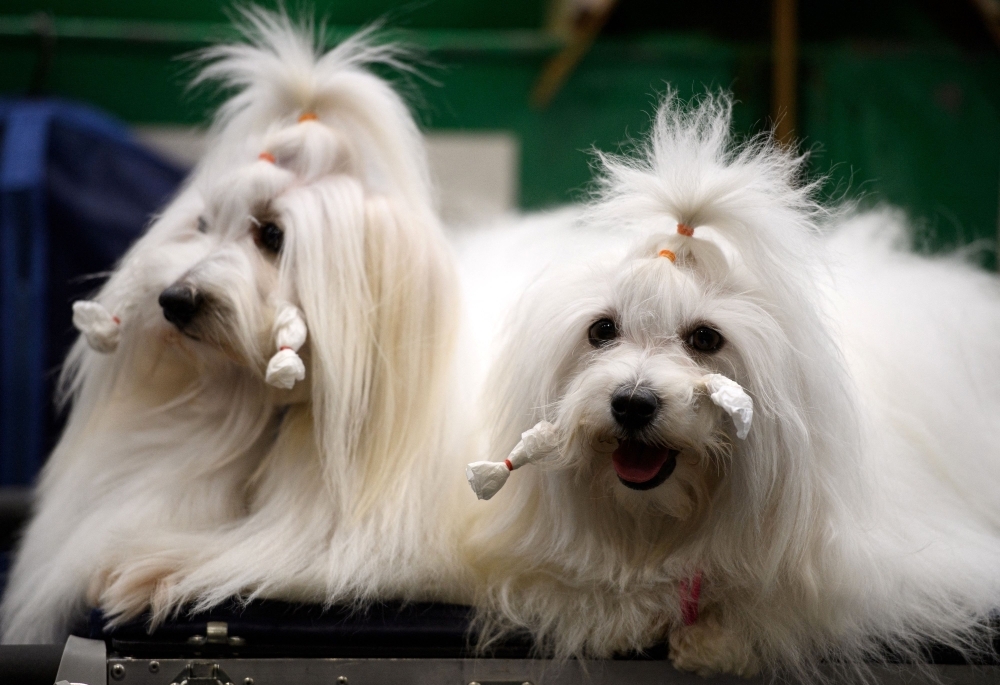 زوجان من كلاب (Coton de Tulear) يستريحان على طاولة قبل الحكم عليهما في اليوم الثالث من عرض (Crufts) للكلاب في المركز الوطني للمعارض في برمنجهام، وسط إنجلترا. (أ ف ب)