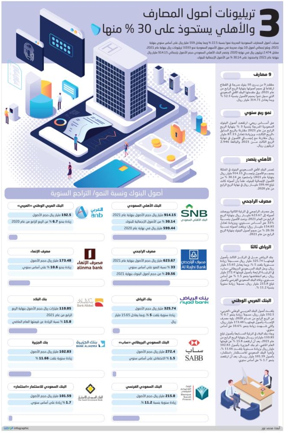 حققت 9 من بين 10 بنوك مدرجة في القطاع ارتفاعاً في حجم أصولها بنهاية الربع الرابع من عام 2021، وفي مقدمتها البنك الأهلي السعودي الذي سجل نموا بحجم الأصول بنسبة 52.5 % وبما يعادل 314.71 مليار ريال.