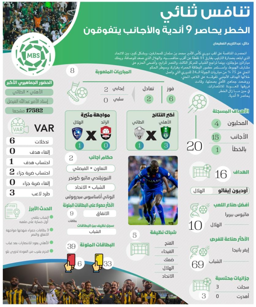 انحصرت المنافسة على لقب دوري كأس الأمير محمد بن سلمان للمحترفين، وبشكل كبير، بين الاتحاد الذي ابتعد بصدارة الترتيب بفارق 11 نقطة عن أقرب منافسيه، والهلال الذي صعد للوصافة، ويملك مباراتين مؤجلتين، بينما تراجع الشباب للمركز الثالث، والنصر للرابع، وأضحى الحزم على مشارف الهبوط، واستمر حضور البطاقة الحمراء بغزارة، وسيطر الحكم المحلي على 75 % من مباريات الجولة الـ24 للدوري التي واصل خلالها الهداف الأجنبي تفوقه على اللاعب المحلي، ووضعت جماهير الأهلي بصمتها، وقادت فريقها للعودة للانتصارات. في حين ما زال الخطر يحاصر 9 أندية.