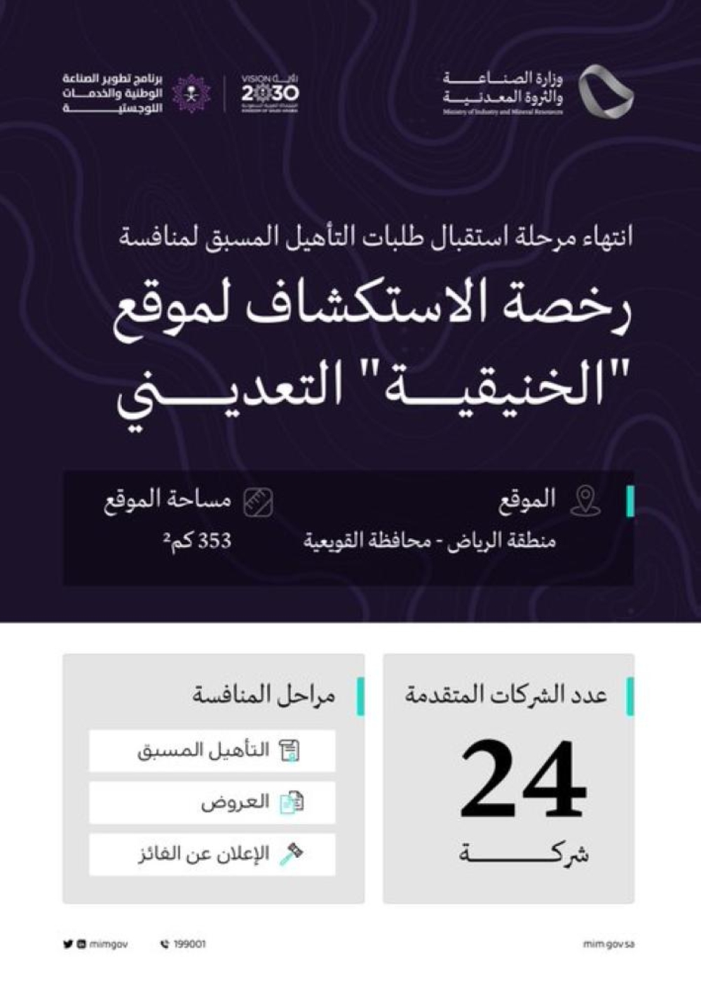 يذكر أن الوزارة أعلنت عن طرح رخصة الاستكشاف عن طريق المنافسة في موقع الخنيقية التابع لمحافظة القويعية بمنطقة الرياض مطلع العام الحالي، الذي يحتوي على: خامات الزنك والنحاس، وذلك ضمن مبادرة "برنامج الاستكشاف المسرّع"، حيث تعد هذه المنافسة نقلة نوعية نحو رحلة استغلال الموارد المعدنية الهائلة في المملكة.