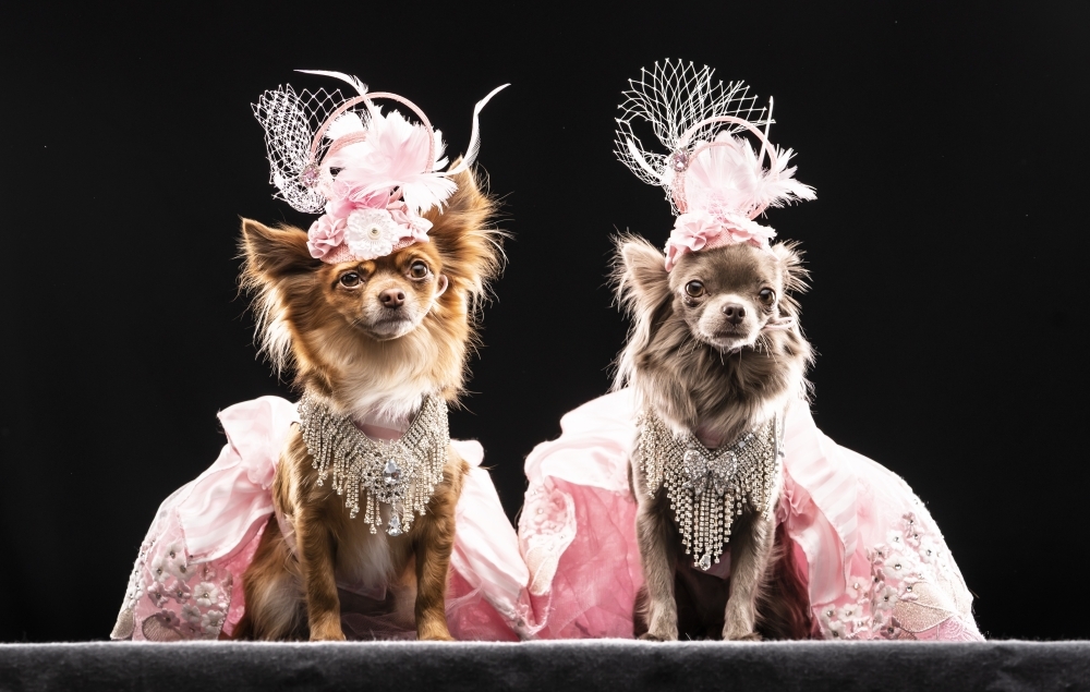 كلبتان استعراضيتان خلال يوم هوليوود في مسابقة فربابيس للكلاب تحت عنوان أوسكار في قاعة كولينجهام التذكارية. (د ب أ)
