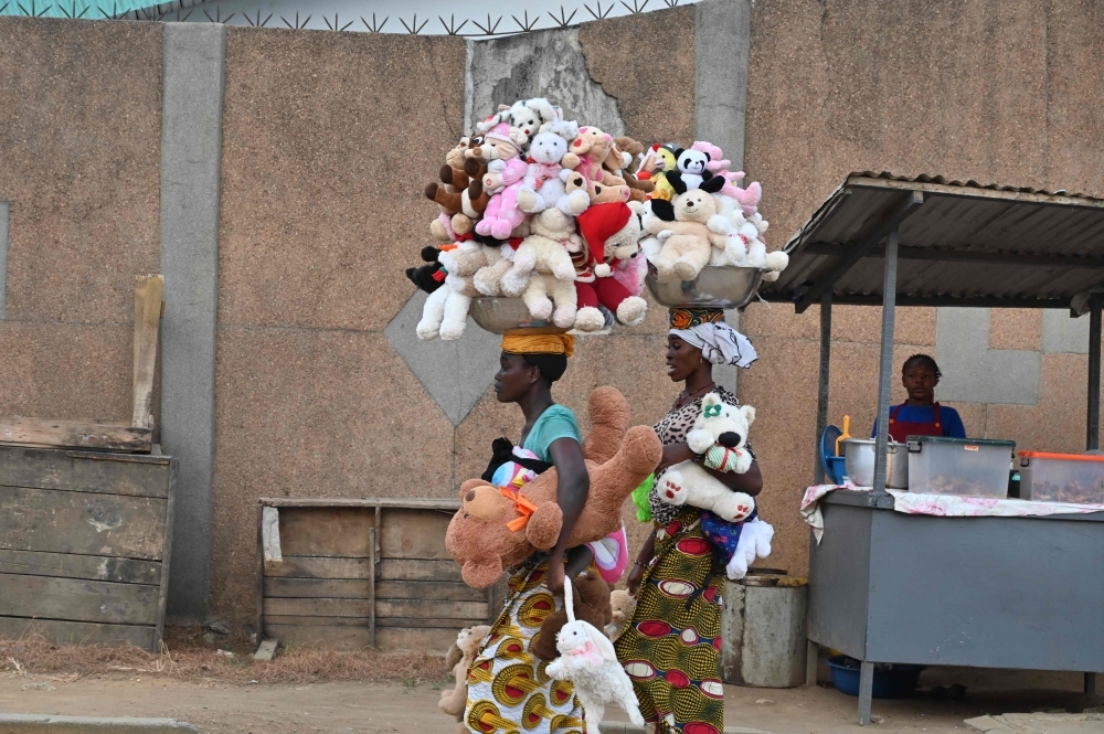 بائعات دمى ناعمة في شوارع «أبوبو»، إحدى ضواحي أبيدجان. (أ ف ب)