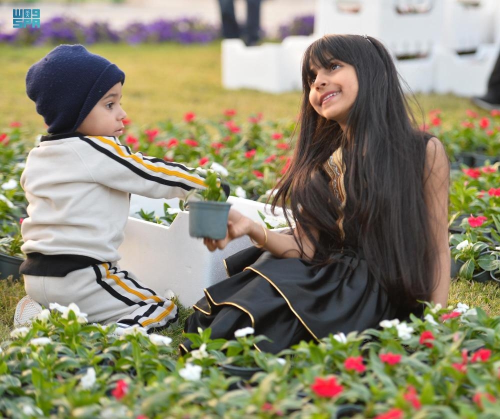 فرحة الأطفال وابتهاجهم بمشاركتهم في زراعة سجادة تحوي 6 آلاف زهرة على شكل فانوس رمضاني ، ضمن فعاليات مهرجان الزهور الثاني بالقطيف. «واس»