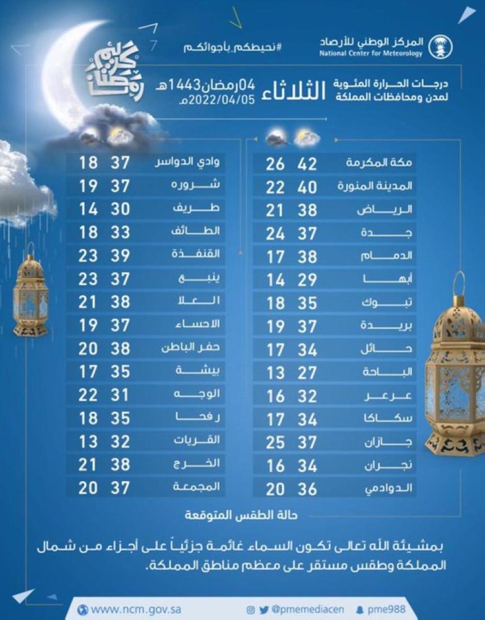حيث أشار المركز في توقعاته إلى أن الطقس سيكون صحو إجمالا بينما تصل درجة الحرارة العظمى بمكة إلى 42 درجة مئوية و40 درجة في المدينة.