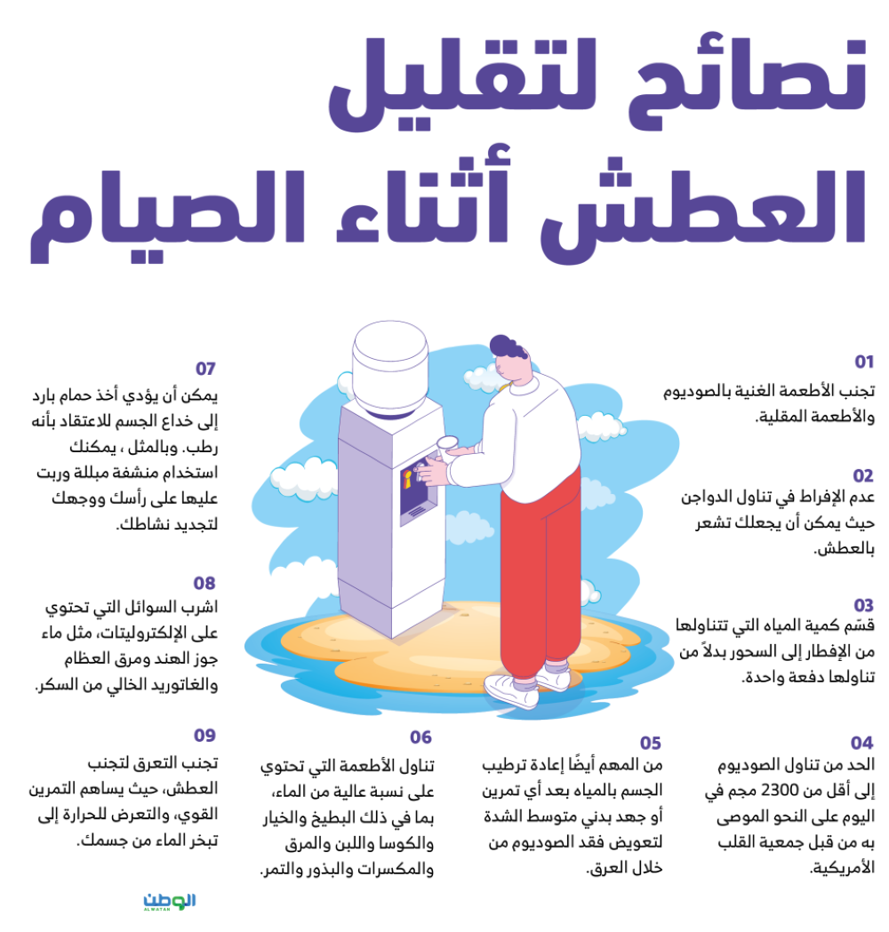 قسّم كمية المياه التي تتناولها من الإفطار إلى السحور بدلاً من تناولها دفعة واحدة.