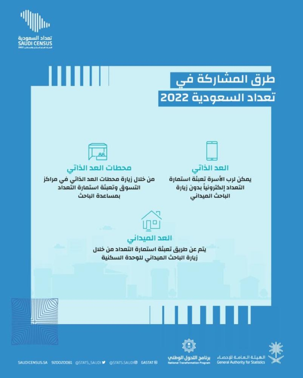 1- العد الذاتي: حيث يمكن لربّ الأسرة تعبئة استمارة التعداد إلكترونيا بدون زيارة الباحث الميداني.