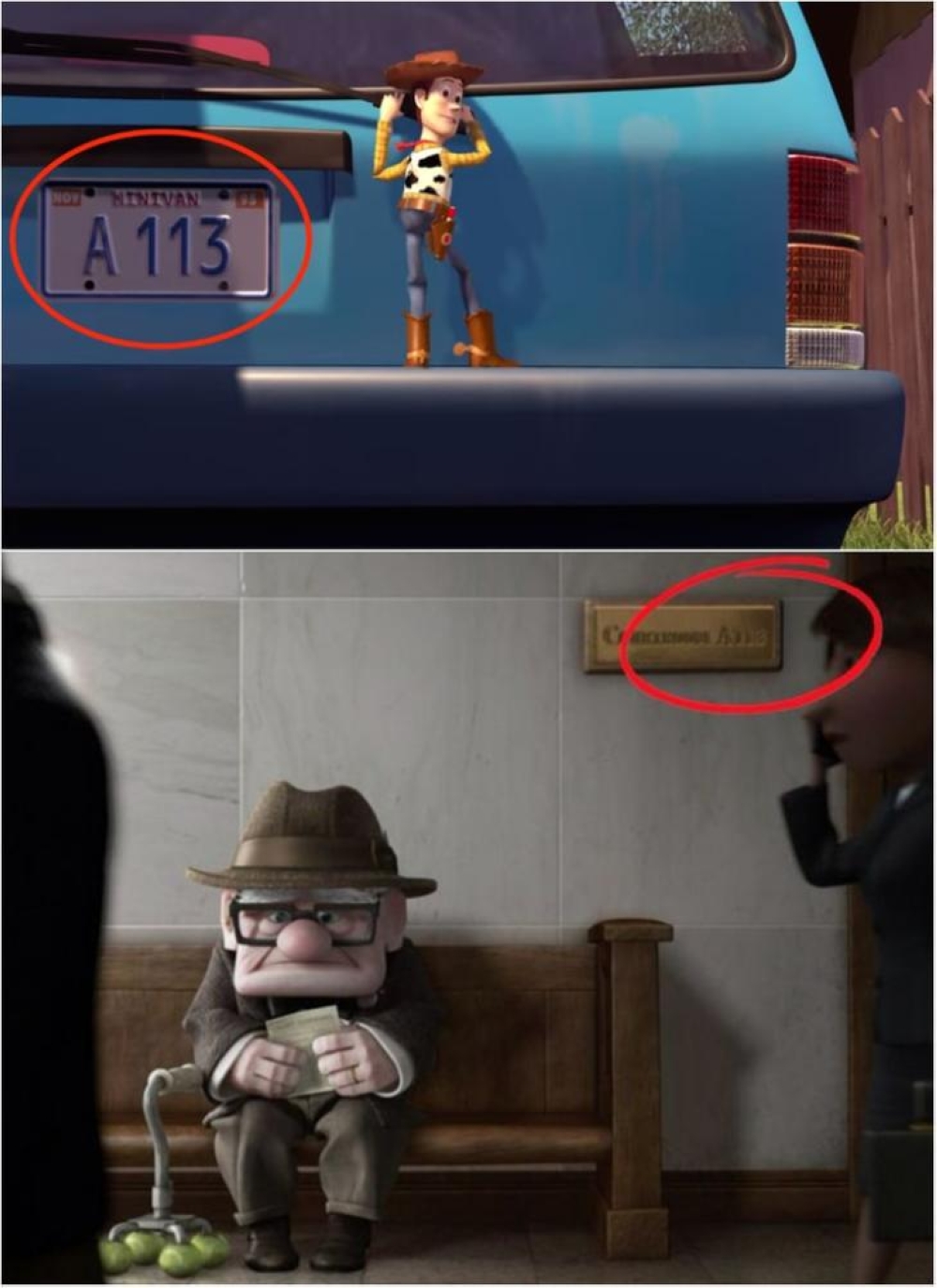 إن كنت شخصا يلتفت إلى التفاصيل، فربما انتبهت إلى الرمز A113 الذي يتكرر في أفلام بيكسار كفيلم Up وفيلم حكاية لعبة وبريف.