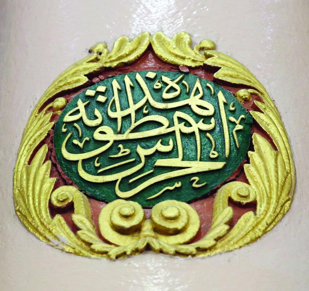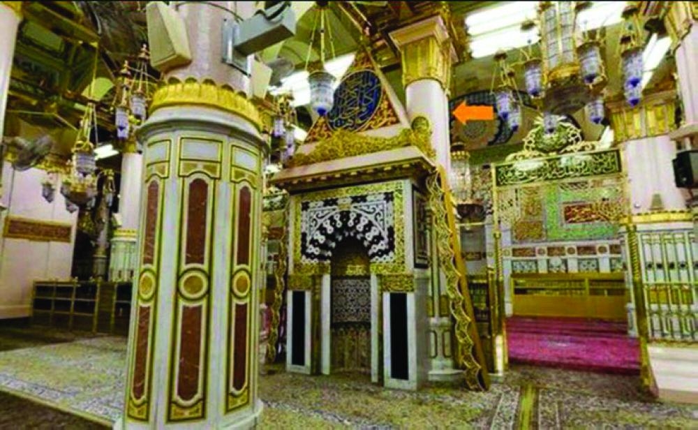 وتتزخرف تلك الأعمدة وتحمل أسماء واضحة كتبت بالخط المذهب، وسط إطار ذهبي بخلفية خضراء.