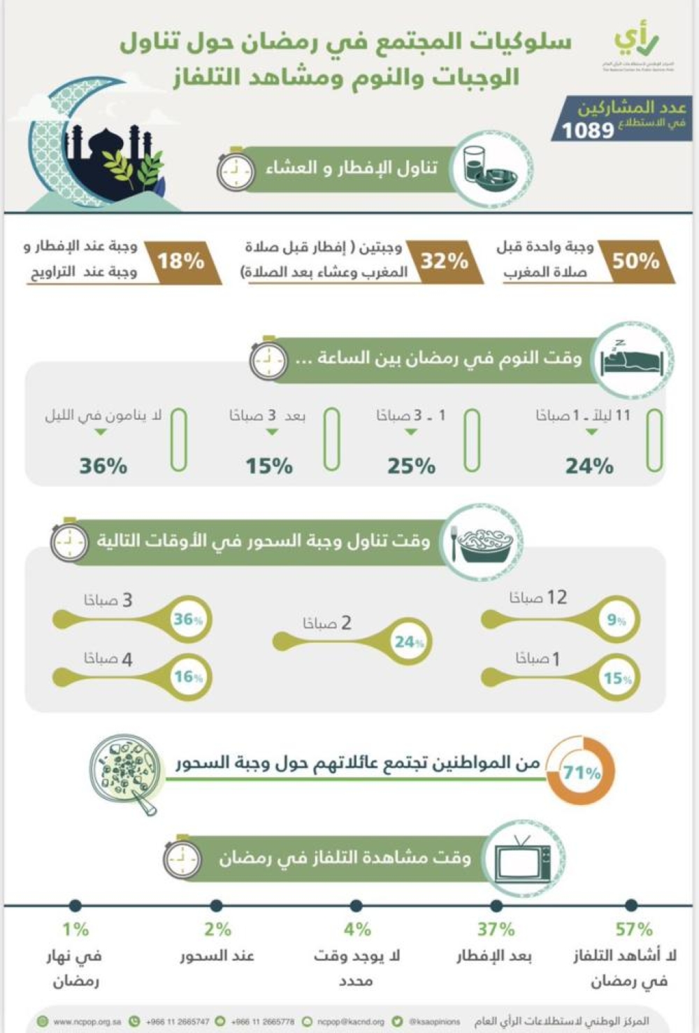وكشف الاستطلاع الذي يهدف لمعرفة الكثير من عادات المواطنين في رمضان، أن نصفهم يتناولون وجبة العشاء مدمجة مع الإفطار، ونصفهم يتناولون وجبة السحور عند السحر (3 إلى 4 ص)، 71% تلتئم عوائلهم على السحور، وأكثر من نصفهم لا يشاهدون التلفزيون. وشارك في الاستطلاع 1089، أعمارهم فوق 18 عاما.