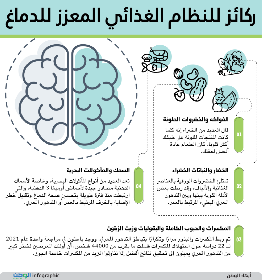 تعد العديد من أنواع المأكولات البحرية، وخاصة الأسماك الدهنية مصادر جيدة لأحماض أوميغا 3 الدهنية، والتي ارتبطت منذ فترة طويلة بتحسين صحة الدماغ وتقليل خطر الإصابة بالخرف المرتبط بالعمر أو التدهور المعرفي.