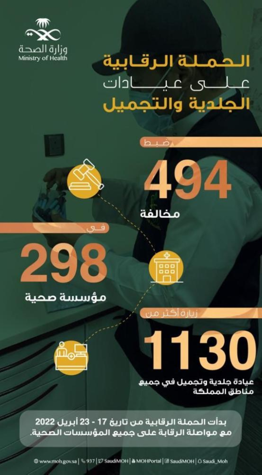 وشملت المخالفات 34 مخالفة إستخدام أجهزة ومنتجات غير مرخصة من الهيئة العامة للغذاء والدواء و132 مخالفة قصور في مكافحة العدوى التعقيم والتخلص الآمن من النفايات الطبية، و137 مخالفة عدم وجود قائمة بأسماء الأطباء وامتيازاتهم في مكان بارز ، و 42 مخالفة ممارسة المهنة الصحية بدون ترخيص نظامي ، و 48 مخالفة تجاوز الاختصاص و 101 مخالفة عدم وجود أو تطبيق نموذج بطاقة معلومات الإجراء للمراجع في عيادة الجلدية والتجميل.