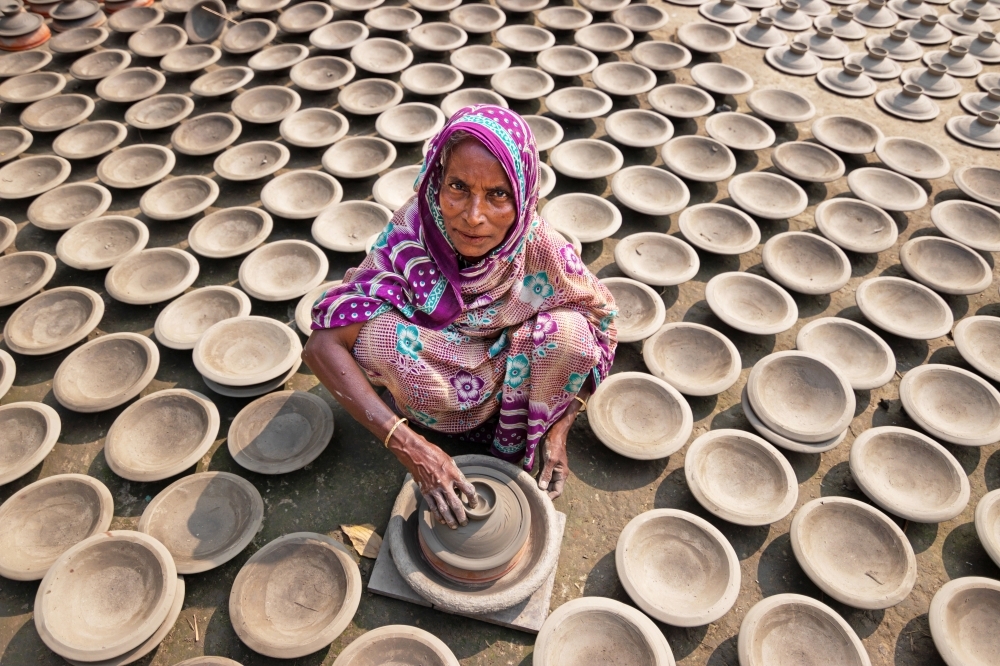 امرأة ترتب الأواني الفخارية قبل نقلها لبيعها في أحد الأسواق في براهمانباريا. كل يوم، يتم إنتاج حوالي 3000 وعاء ثم يتم بيعها في الأسواق بحوالي 2 يورو لكل منها. «د ب أ»