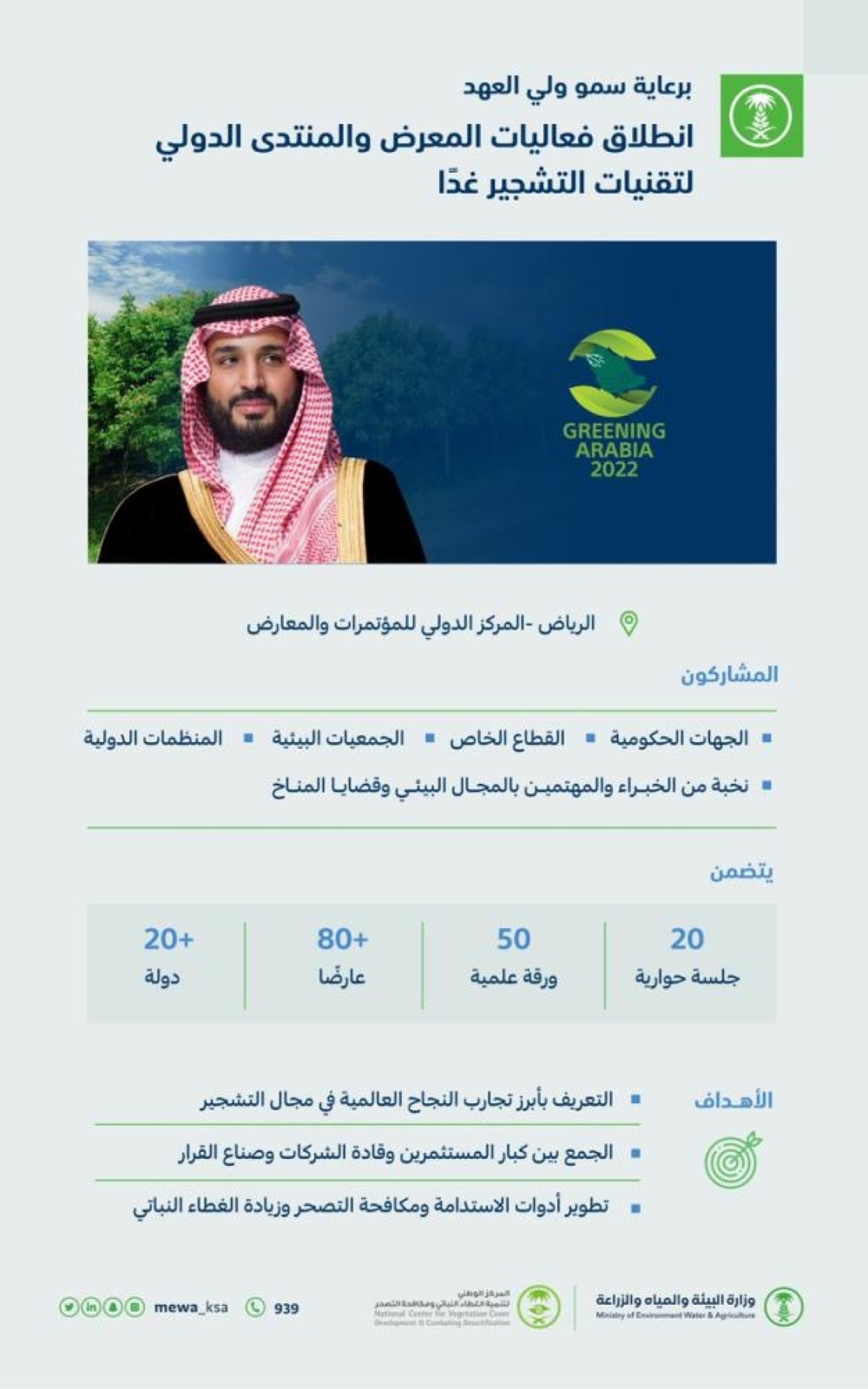 ويشارك في المعرض والمنتدى عدد كبير من الجهات الحكومية، والقطاع الخاص، والجمعيات البيئية، والجهات والمنظمات الدولية، إضافة إلى نخبة من الخبـراء والمهتميـن بالمجـال البيئـي وقضايـا المنـاخ، ويتضمن أيضًا 20 جلسة حوارية وورشة علمية سيُقدَّم خلالها نحو 50 ورقة علمية، وأكثر من 80 عارضًا لمنتجاتهم ومشروعاتهم وابتكاراتهم، التي تعد أحـدث مستجدات التقنيـة فـي مجـال مكافحـة التصحـر والتخفيـف مـن آثـاره وتنميـة الغطـاء النباتـي وحمايتـه، وأفضل التجـارب والأبحـاث والدراسات العلمية عالميًا.