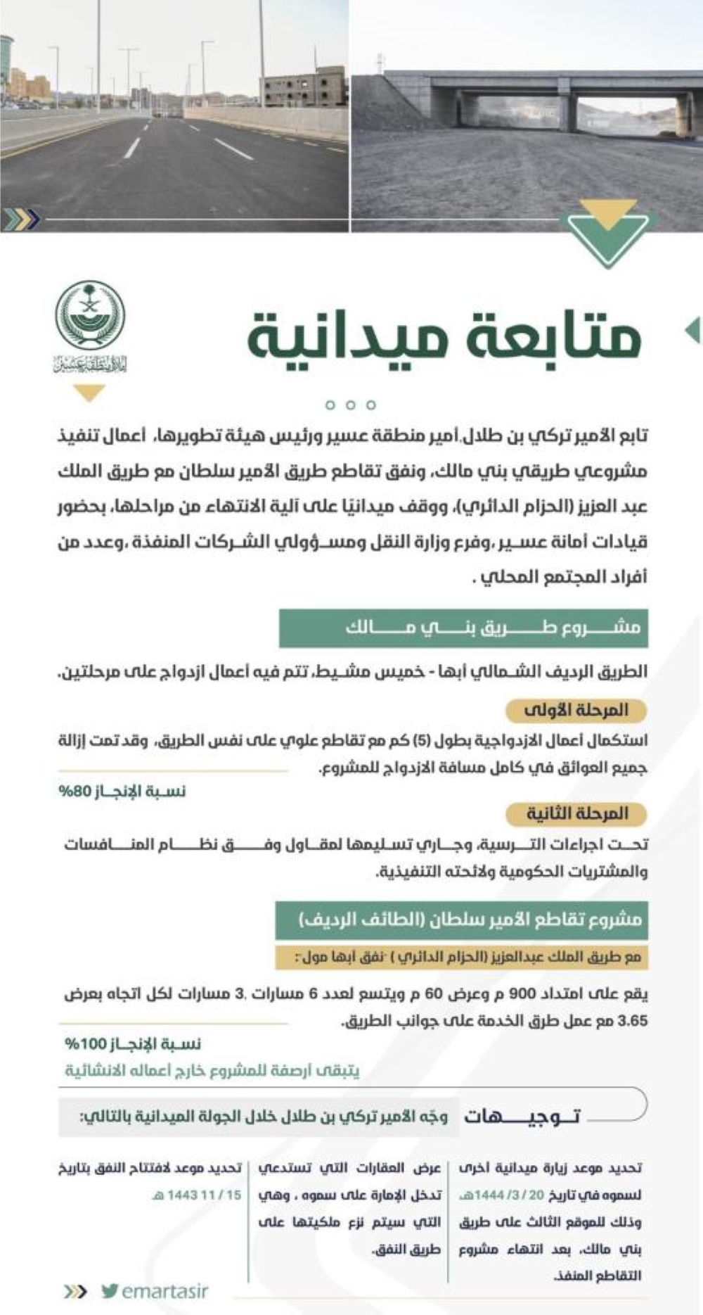في الجانب العملي، تابع أمير عسير، رئيس هيئة تطويرها الأمير تركي بن طلال أعمال تنفيذ مشروعي طريقي بني مالك، ونفق تقاطع طريق الأمير سلطان مع طريق الملك عبدالعزيز (الحزام الدائري)، وهما مشروعان من الطرق المحورية التي تهدف لتسهيل الحركة المرورية في أبها من خلال تخفيف الضغط على «الحزام الدائري» والقضاء على الاختناقات المرورية على طريق الملك فهد خاصة على كوبري العرين ومدخل المدينة الرئيس والمؤدي إلى دوار القصبة سابقًا.