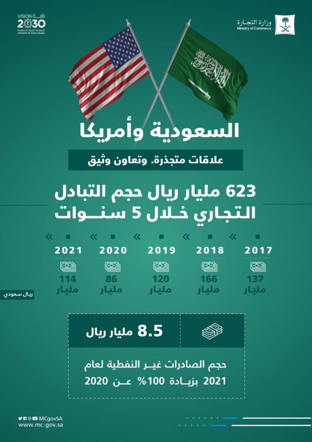 وأجرى الوفد اجتماعات ثنائية مع عدد من المسؤولين الأمريكيين الحكوميين في مقر وزارة التجارة الأمريكية بهدف مأسسة وتعزيز التواصل الحكومي بين الجانبين على جميع المستويات، إضافة إلى استعراض أبرز الاصلاحات المنفذة لزيادة تنافسية المملكة.