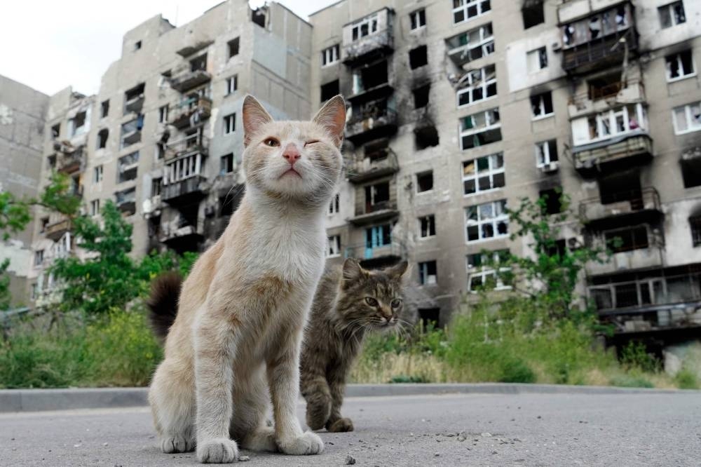 قطتان متضررتان أمام مبنى سكني مدمر في مدينة ماريوبول، وسط العمل العسكري الروسي المستمر في أوكرانيا. «أ ف ب»