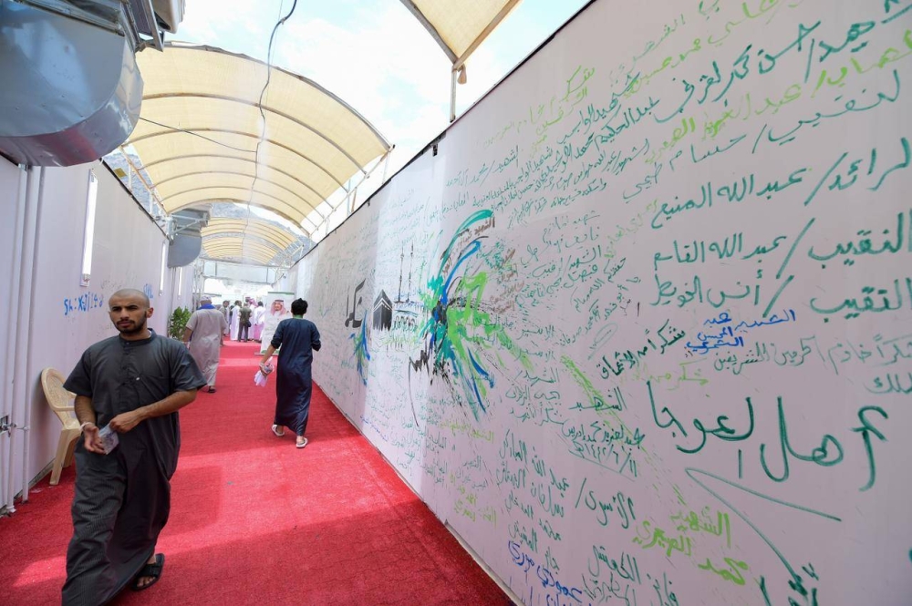 وخط الحجاج شكرهم وتقديرهم ومشاعرهم الجياشة تجاه خادم الحرمين، وولي عهده الأمين، إذ تسابق الضيوف قبل مغادرتهم مشعر منى لأداء طواف الوداع إلى خط كلماتهم بعد أن أتموا الركن الخامس، مدونين عليها عبارات الشكر والثناء لما وجدوه من خدمات واهتمام من اللجان العاملة بالبرنامج.
