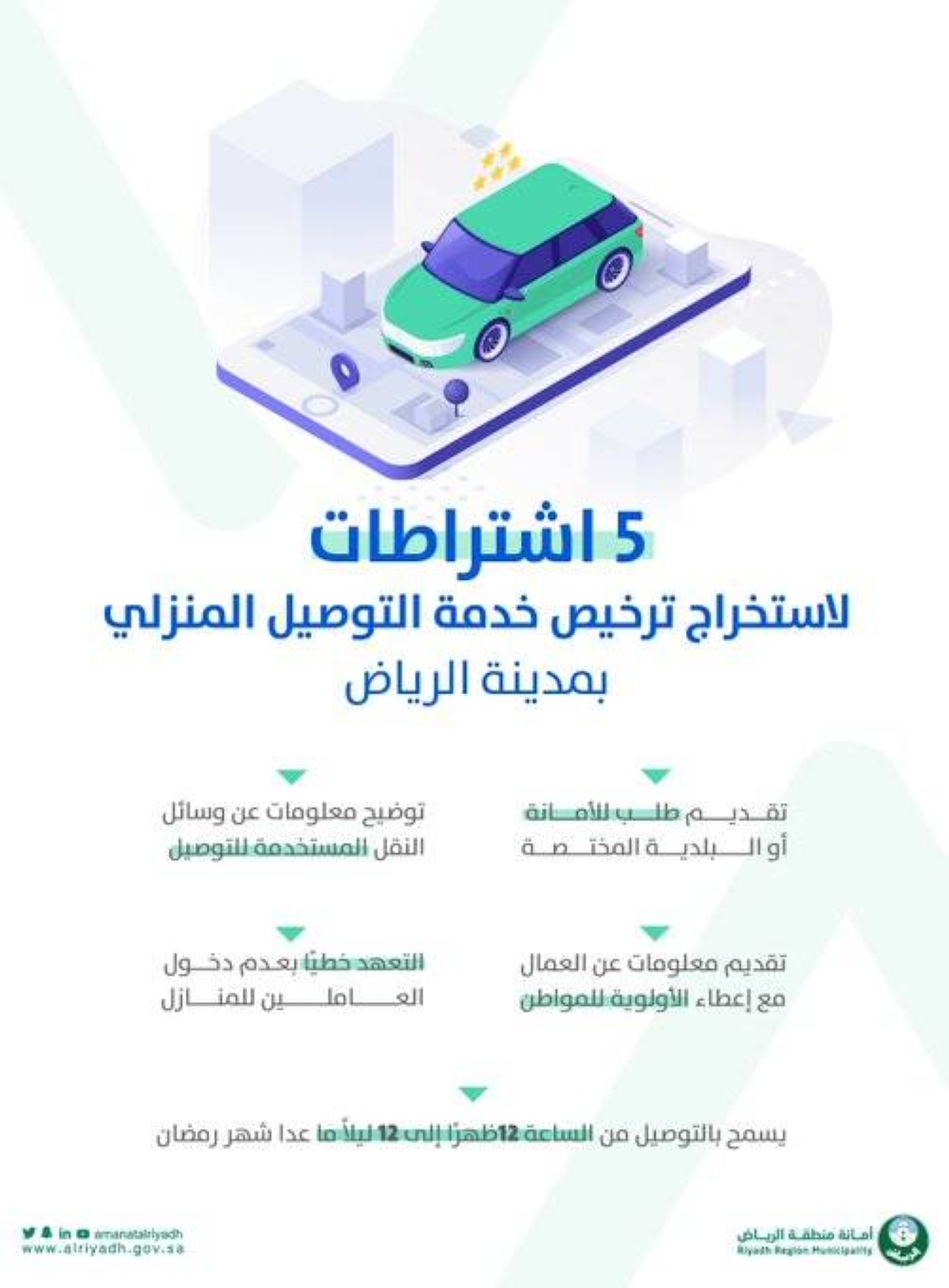 وأوضحت الأمانة، أن الاشتراطات تشمل تقديم طلب للأمانة أو البلدية المختصة، وتوضيح معلومات عن وسائل النقل المستخدمة للتوصيل، وتقديم معلومات عن العمال مع إعطاء الأولوية للمواطن.