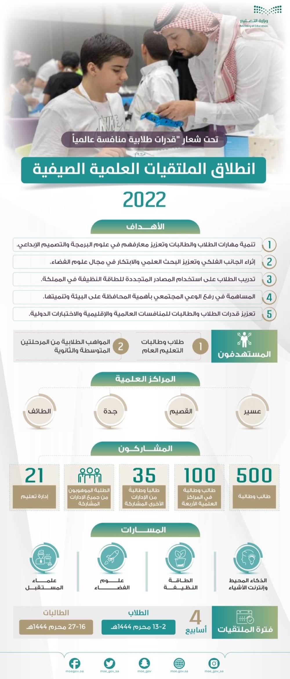 وتستمر الملتقيات لمدة أربعة أسابيع بدءاً من 2 إلى 27 محرم الجاري تحت شعار: "قدرات طلابية منافسة عالمياً"، وتتضمن أربعة مسارات علمية، تتمثل في الطاقة النظيفة: (غاز الهيدروجين واستخداماته)، والمباني الخضراء، والاقتصاد الكربوني، وعلوم الفضاء والذكاء الاصطناعي والروبوت وإنترنت الأشياء وعلماء المستقبل (صديق البيئة والمسابقات العلمية).