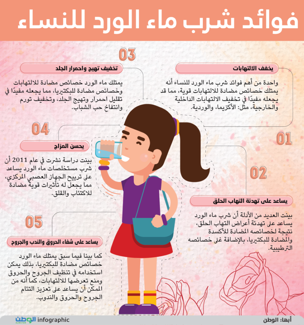 واحدة من أهم فوائد شرب ماء الورد للنساء أنه يمتلك خصائص مضادة للالتهابات قوية، مما قد يجعله مفيدًا في تخفيف الالتهابات الداخلية والخارجية، مثل: الأكزيما، والوردية.