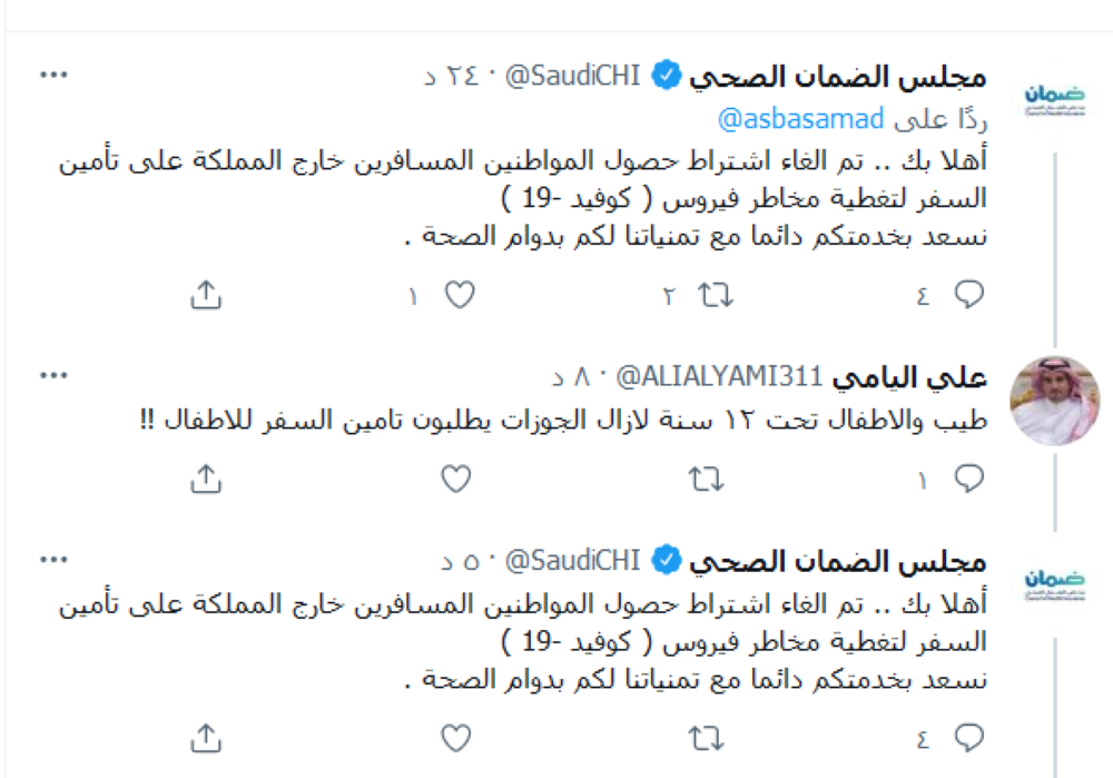 فيما رد حساب مجلس الضمان الصحي الرسمي على استفسارات متابعيه اليوم، أنه تم إلغاء اشتراط حصول المواطنين المسافرين خارج المملكة لمن هم دون 12 سنة على تأمين السفر لتغطية مخاطر فيروس (كوفيد-19)، لا يزال حساب الجوازات الرسمي في تويتر يرد على الاستفسارات بهذا الخصوص ويضع الاشتراطات السابقة التي تنص على اشتراط وجود بوليصة تأمين ضد كورونا للفئة العمرية أقل من 12 سنة للراغبين في السفر الخارجي.