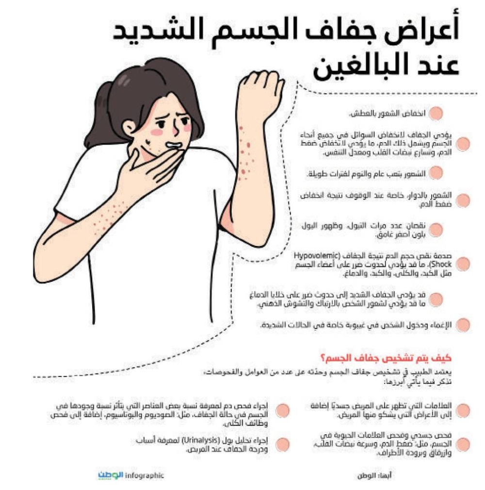 يؤدي الجفاف لانخفاض السوائل في جميع أنحاء الجسم ويشمل ذلك الدم، ما يؤدي لانخفاض ضغط الدم، وتسارع نبضات القلب ومعدل التنفس.
