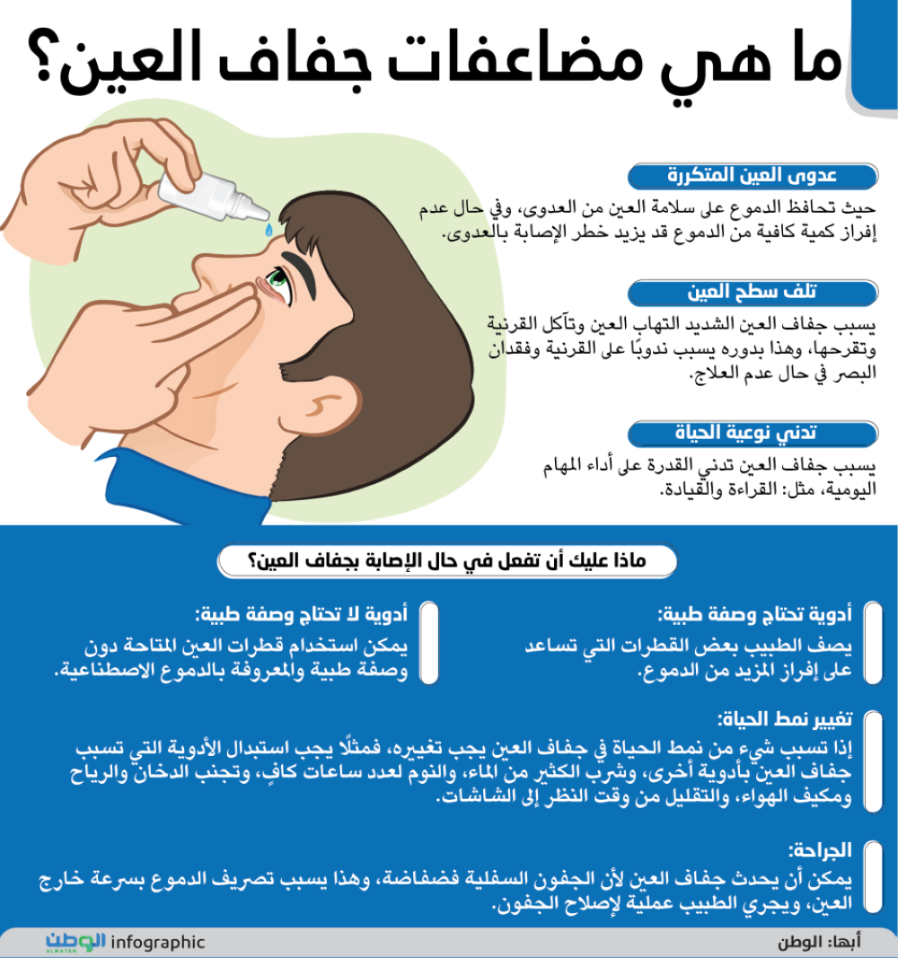 حيث تحافظ الدموع على سلامة العين من العدوى، وفي حال عدم إفراز كمية كافية من الدموع قد يزيد خطر الإصابة بالعدوى.