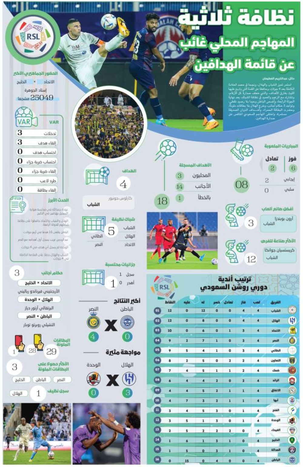 استمر تميز الشباب والهلال، ونجحا في حصد العلامة الكاملة بعد 4 جولات، وحافظا على القمة التي يتربع عليها الليث بفارق الأهداف، والذي خطف صدارة كل الأرقام، وتشارك مع الزعيم والعميد في نظافة الشباك، بعد نهاية الجولة الرابعة، وأضحى الباطن وحيدا بلا رصيد نقطي، وتواجد 3 حكام أجانب، وخرج الهلال بلا بطاقات ملونة، وحضرت البطاقة الحمراء، وأهداف النيران الصديقة مستمرة، واختفى المهاجم السعودي المنافس على صدارة الهدافين.